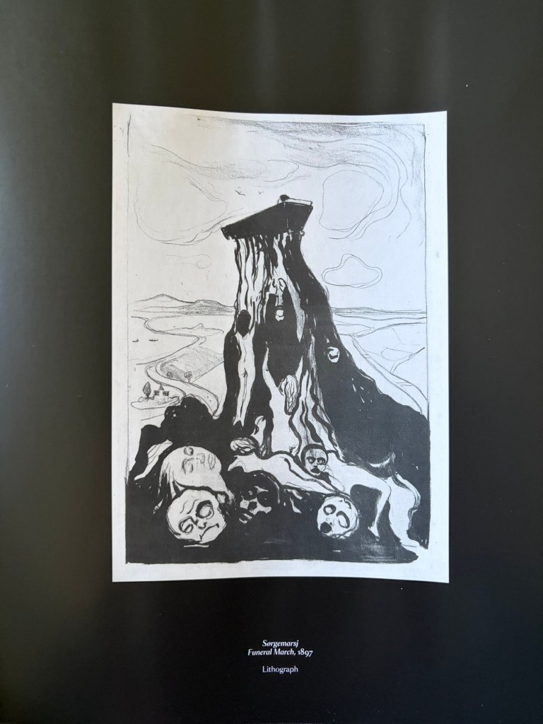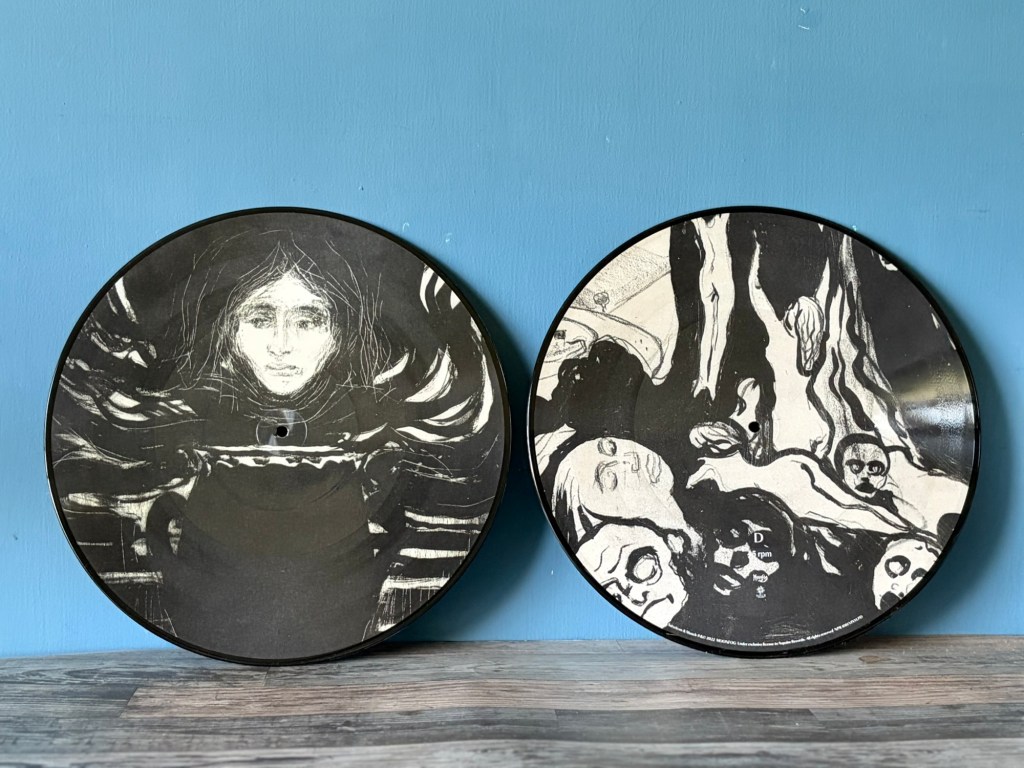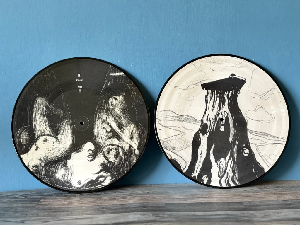 全黑的專輯封面,在布幕與凸出的後方臉孔四周圍,彷彿痛苦猙獰表情的褶皺,十分契合這次全黑展間的整體氛圍。黑膠與CD等實體格式均將特展中的孟克畫作置入內頁,讓無法到場的樂迷,也能聆聽著音樂,欣賞孟克的作品,彷如穿梭於展場之中。